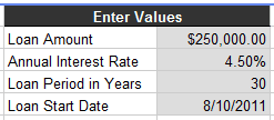 I took this template and I made my own template of something that would work for my needs. I wanted something that would also allow me to add additional amounts at different time periods to see how that would affect my loan. This way I could see how much less interest I would pay in the long run. I made two extra columns, one for a regular amount (so if you payed $30 more than your payment for a year) and a second column for one time larger amounts (maybe from a tax return).