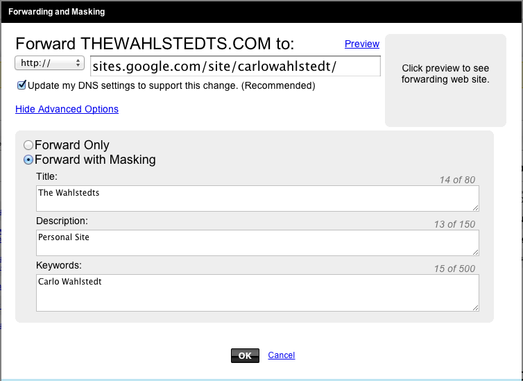 Finally a popup will show what site to forward to and a few other options. Input your site url here and I choose Forward with Masking so that when the site is first opened they can't even tell it's not being directly hosted. Either way, it really won't matter as it will accomplish the same thing, getting the user to your site. Save that and you're done. It can take a while for these changes to take effect so don't be surprised if it doesn't work right away. Come back in a few hours and it's sure to have started working.